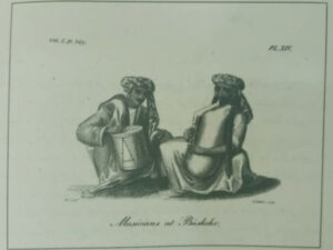 من او را با انبانه در تصویر نشان داده ام و نیز مرد جوانی را که نت های او را با ضربه ی انگشت هایش بر دهل همراهی می کرد. دهل نوعی طبل یا استوانه ی چوبی بود که هر دو طرفش با پوست پوشیده شده و یکی از آن ها بسیار محکم بسته شده بود تا صدایی بلندتر از یک اُکتاو(؟) از دیگری داشته باشد.))