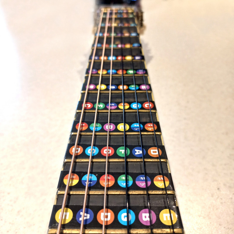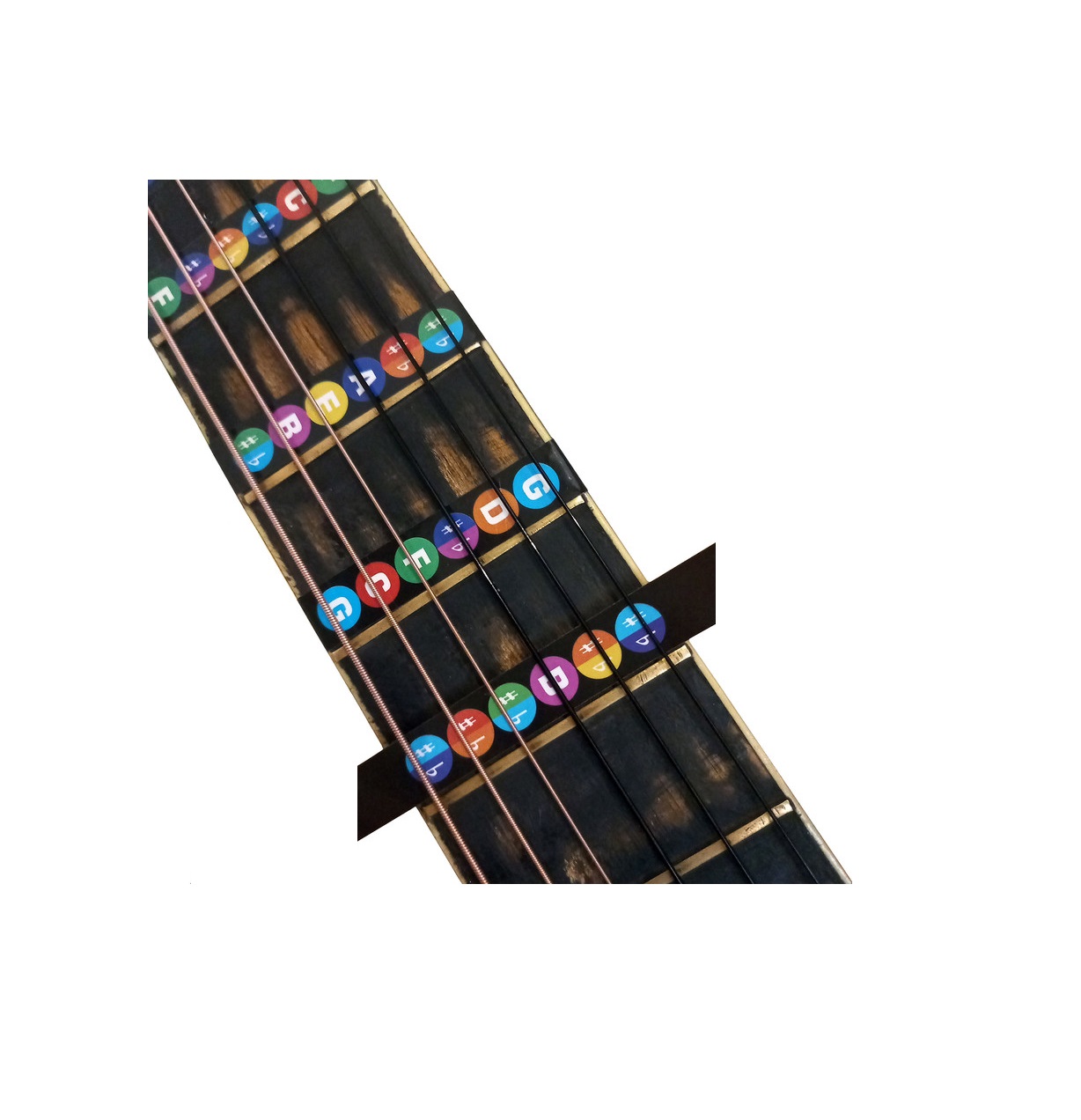 برچسب نت های دسته گيتار مناسب برای گیتار های کلاسیک، آکوستیک و الکتریک. این برچسب برای نوآموزان گيتار طراحی و توليد شده است که به راحتی بتوانند جای نت ها را روی دسته گيتار از فرت 1 تا 12 پيدا کنند و گام نوازی در گيتار را کاملا بی نقص اجرا کنند. جای نت های ديز و بمل نیز بر روی برچسب ها مشخص شده تا هنرجو بتواند به راحتی جای ديز و بمل ها را نیز روی دسته گيتار پيدا کند. این محصول به صورت نوار هایی به فرت بورد نصب میشود و به دسته ی گیتار صدمه نمی زند و در زمان دلخواه به راحتی از آن جدا می شود. این برچسب بر اساس سیستم رنگین کمانی از نت دو تا سی رنگ آمیزی شده و تولید نشر همراهان می باشد.