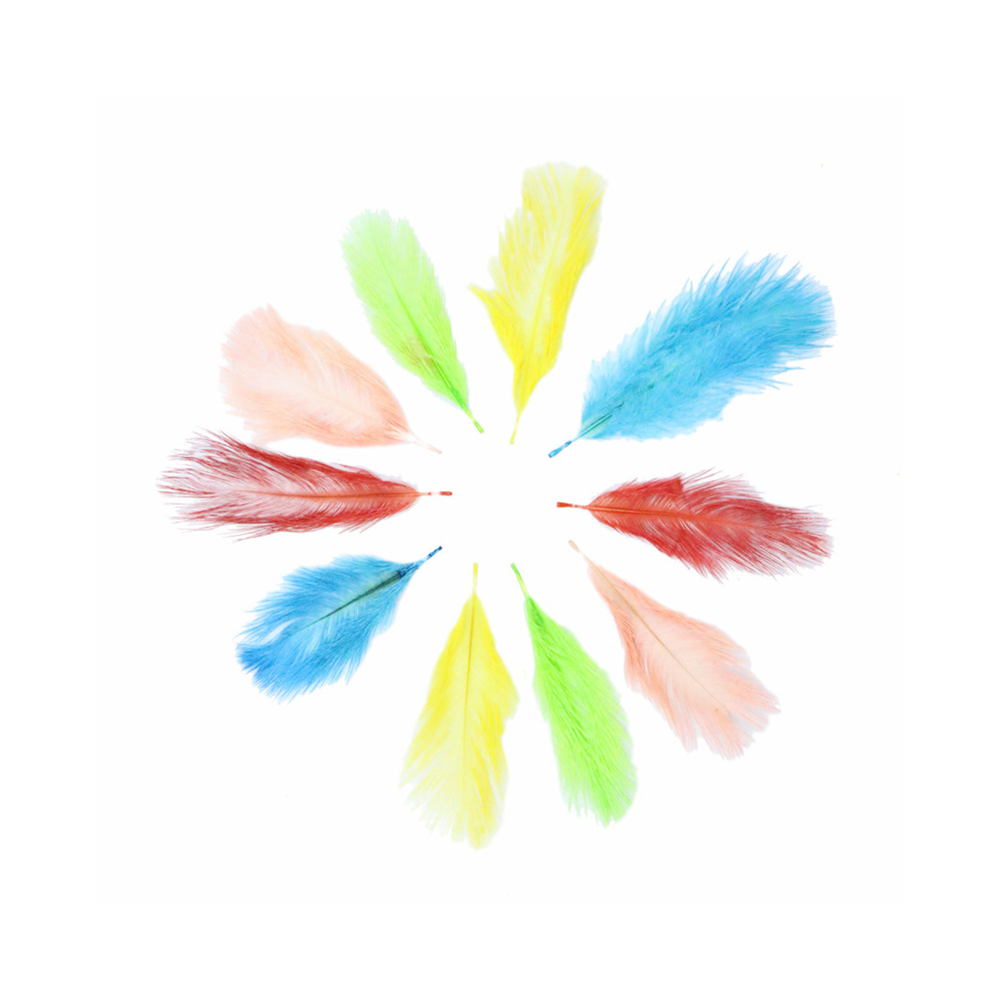 تنوع 6 رنگ شامل ۱۰ عدد پر رنگی متنوع (احتمال تکرار چندین رنگ) مناسب برای تولید دریم کچر (کابوس گیر)، گل سر، عروسک ، جعبه هدیه ، تزئینات لباس ، آموزش کودکان پیش دبستانی و …