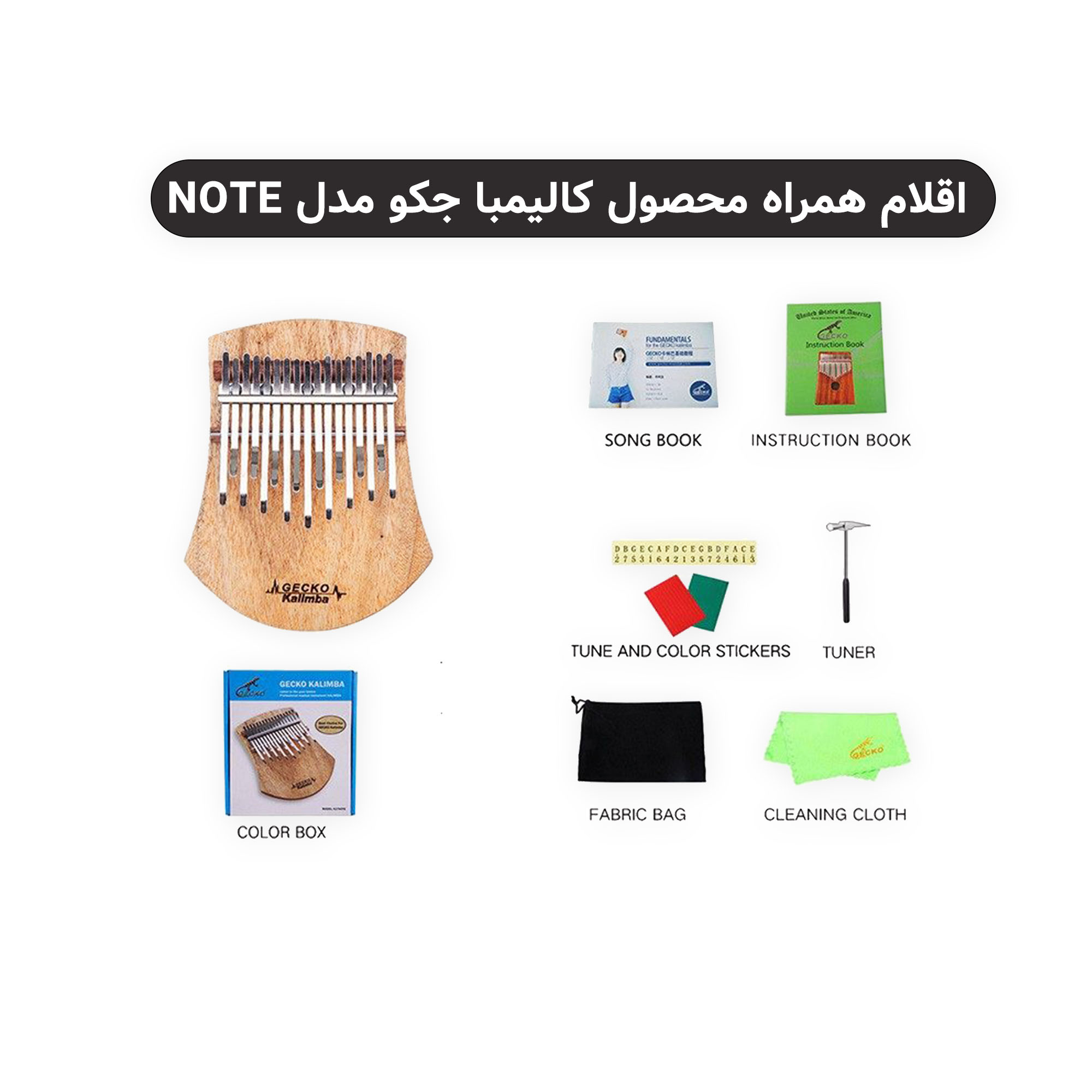 5. اقلام همراه : کاور – چکش کوک – پد نظافت – دفترچه راهنمای کوک و راهنمای ساز – برچسب نت و نشانگر